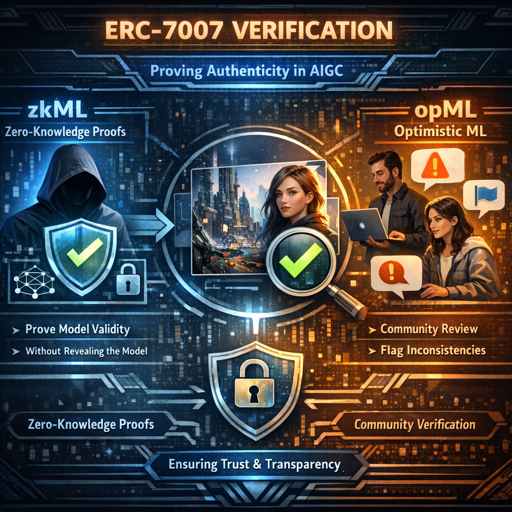 Verification: One of the biggest challenges in AIGC is verifying the authenticity of the creative process. ERC-7007 tackles this by leveraging a combination of zero-knowledge machine learning (zkML) and optimistic machine learning (opML). zkML allows the model owner (the person who trained the AI) to prove the legitimacy of the AI model used to generate the content without revealing the model itself. opML acts as a secondary verification layer, enabling the community to flag inconsistencies and maintain trust in the ecosystem.